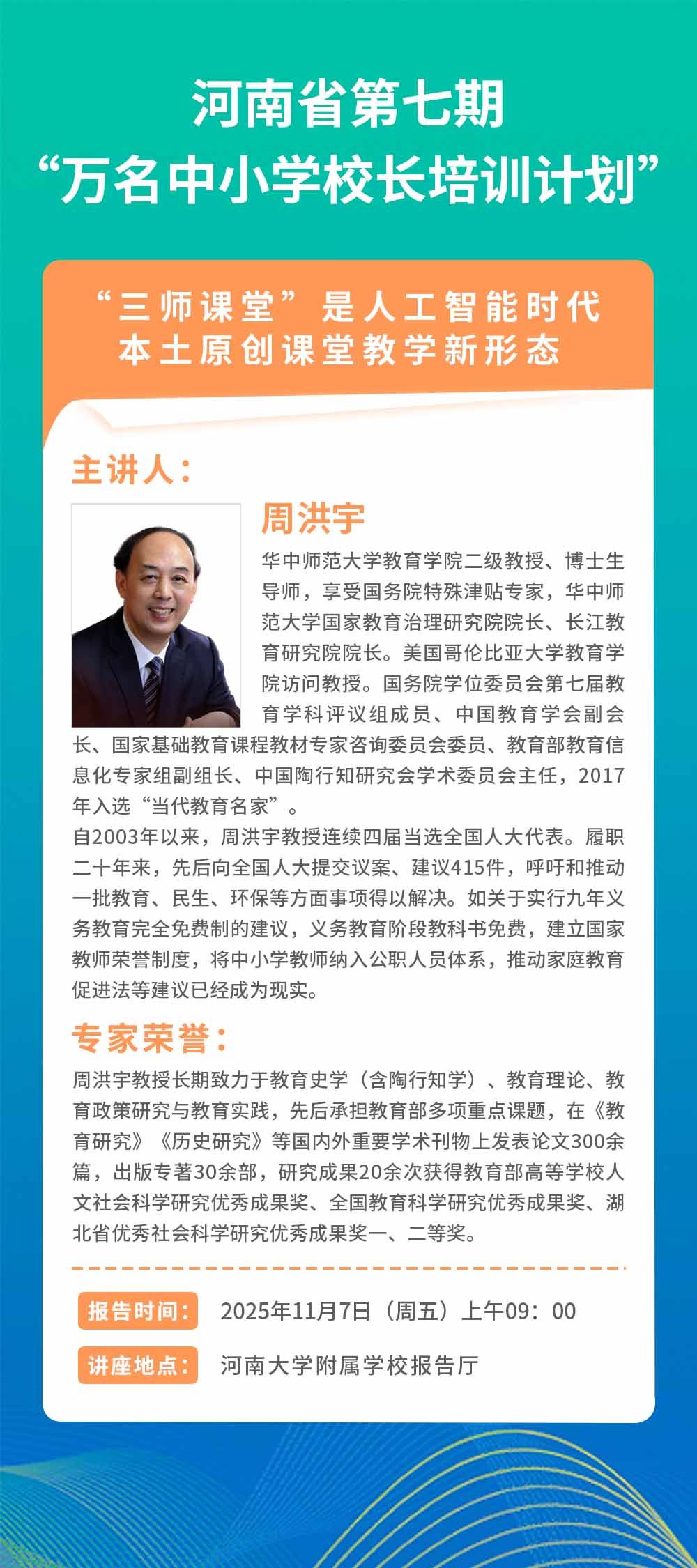 第七期“名家讲座”预告 | 周洪宇:“三师课堂”是人工智能时代本土原创课堂教学新形态