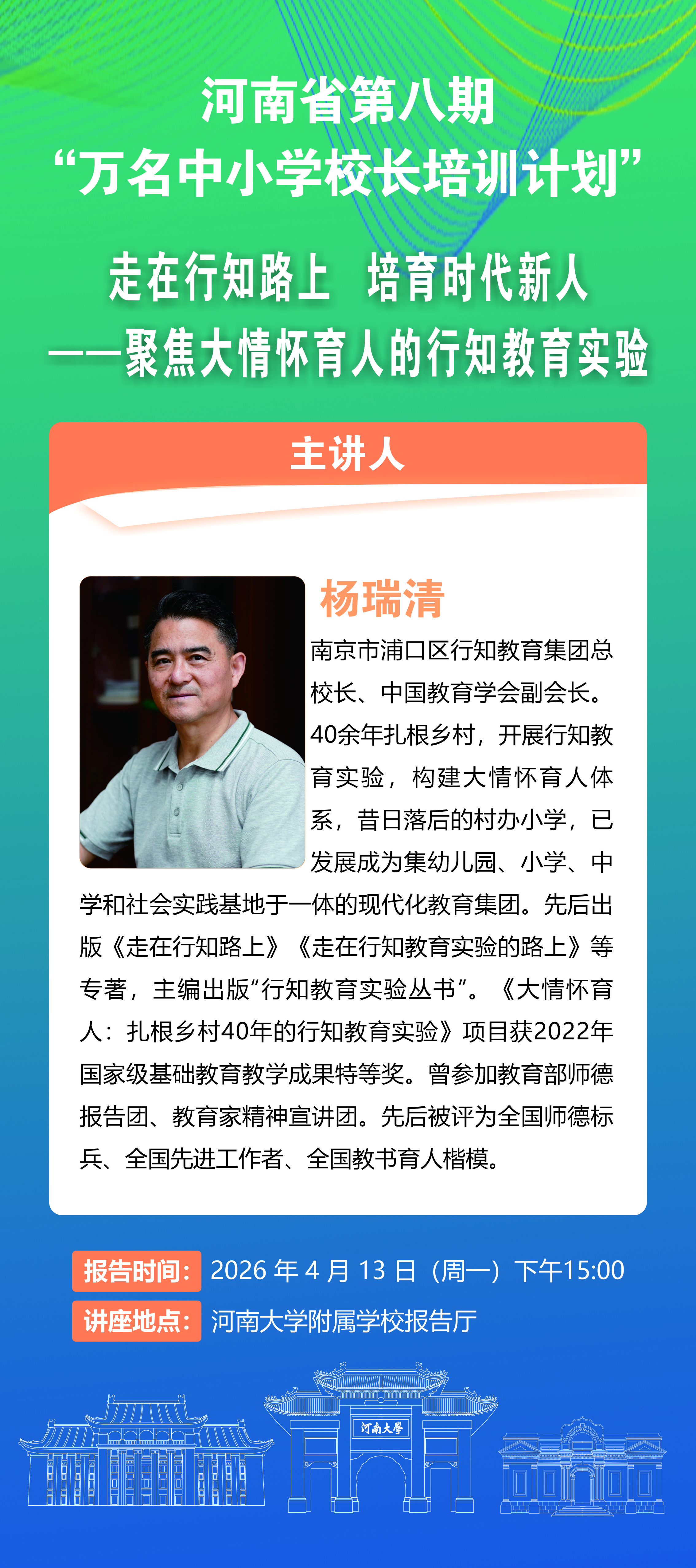 第八期“名家讲座”预告|杨瑞清:走在行知路上 培育时代新人——聚焦大情怀育人的行知教育实验